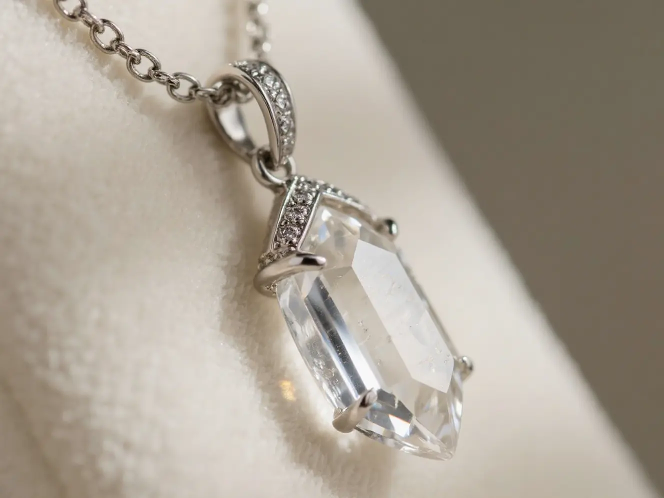這款白水晶吊墜項鍊簡約又精緻。晶體通透,切割工整,在光線下閃閃發亮。銀色鏈條搭配閃鑽點綴,更顯高級。白水晶寓意淨化,戴上它,仿若給心靈做個 SPA,無論日常通勤還是約會,都能為你增添優雅氣質。