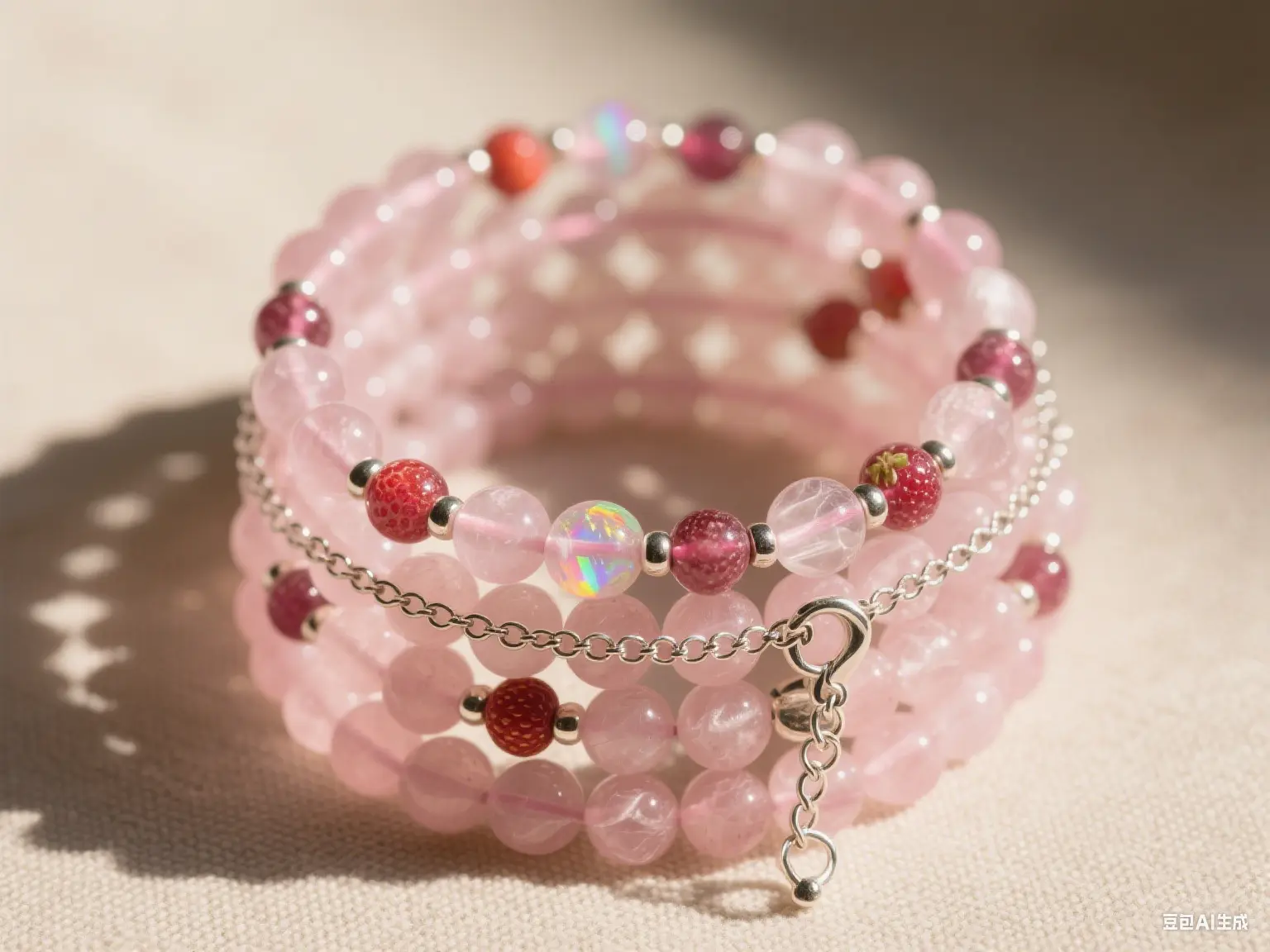 粉晶多圈手鍊也太甜啦!粉晶圓潤飽滿,搭配草莓晶、彩光石等,層次感滿滿。多圈設計時尚百搭,疊戴超吸睛。粉晶代表愛與溫柔,戴上它,好似把滿滿的愛意與好運都纏於腕間,為你帶來浪漫與美好。